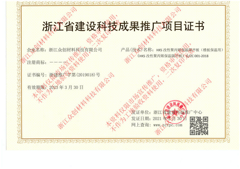 HKS改性聚丙烯保溫隔聲板榮獲浙江省建設科技成果推廣項目證書